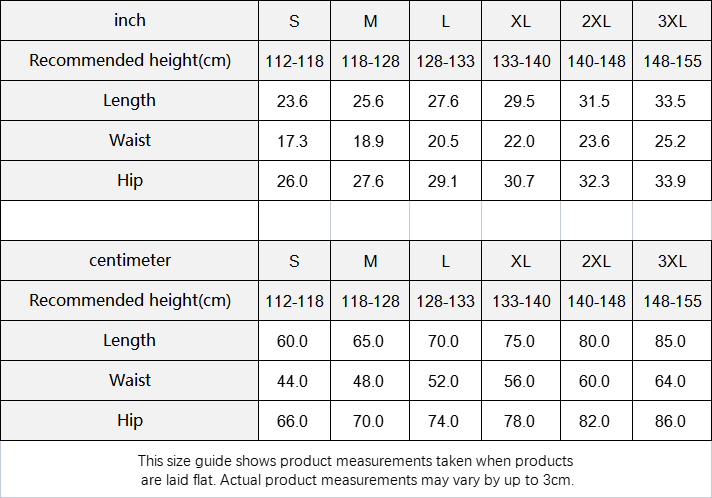 | Waist | 44.0 | 48.0 | 52.0 | 56.0 | 60.0 | 64.0 |